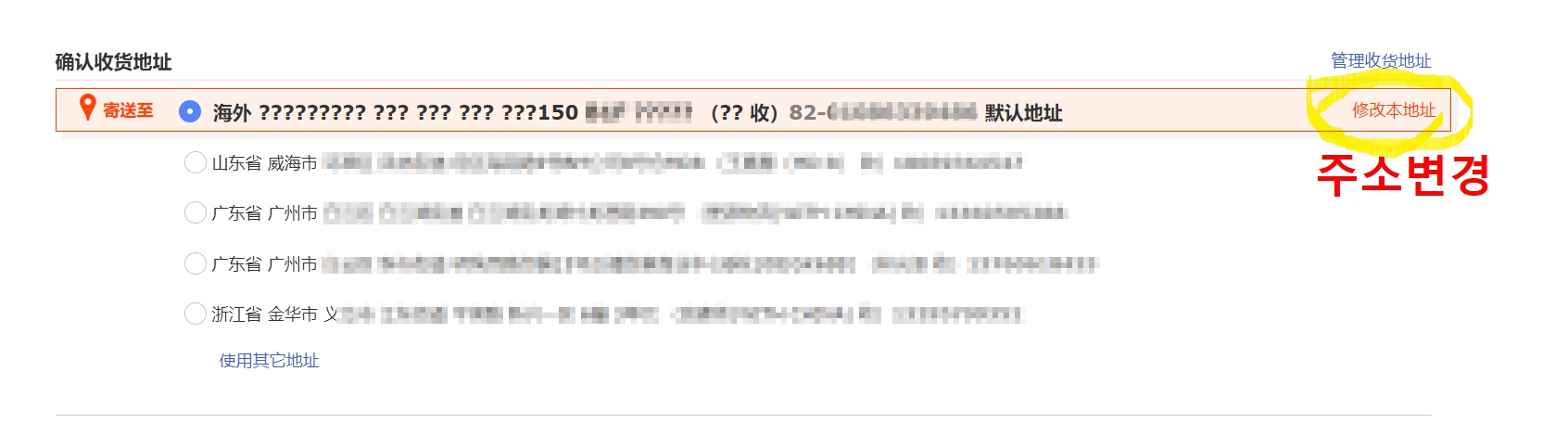 결제 화면으로 넘어가면 먼저 받을 주소를 확인합니다. 제가 구매하려는 제품은 모두 한국직배송이 가능한 제품이라서 한국어 주소를 입력하면 직배송 받을 수 있습니다. 만약 주소를 변경하고 싶다면 주소변경 주황색 텍스트를 눌러 주소를 변경해주세요. 주소입력을 할때는 한국어로 입력하면 됩니다.