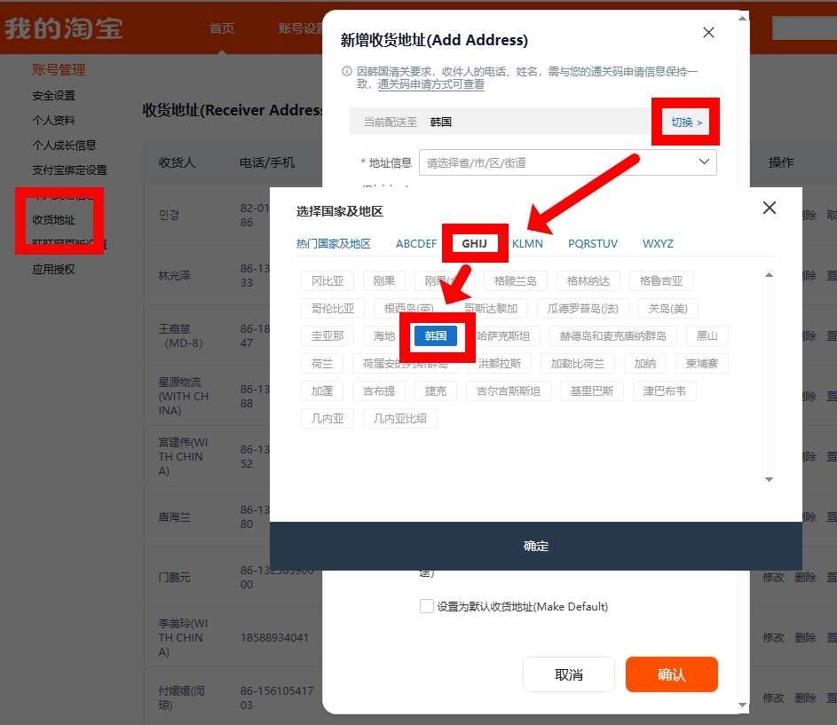 타오바오 로그인 후, 收货地址 관리로 이동 -> ‘新增地址(새 주소 추가)’ 클릭